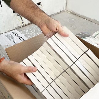 In a later project, we opted for smaller “kit-kat” style tiles with a very similar visual effect, but supplied on mesh backing. The difference was remarkable. Covering all the bathroom walls took only a day, making the installation far more economical overall.